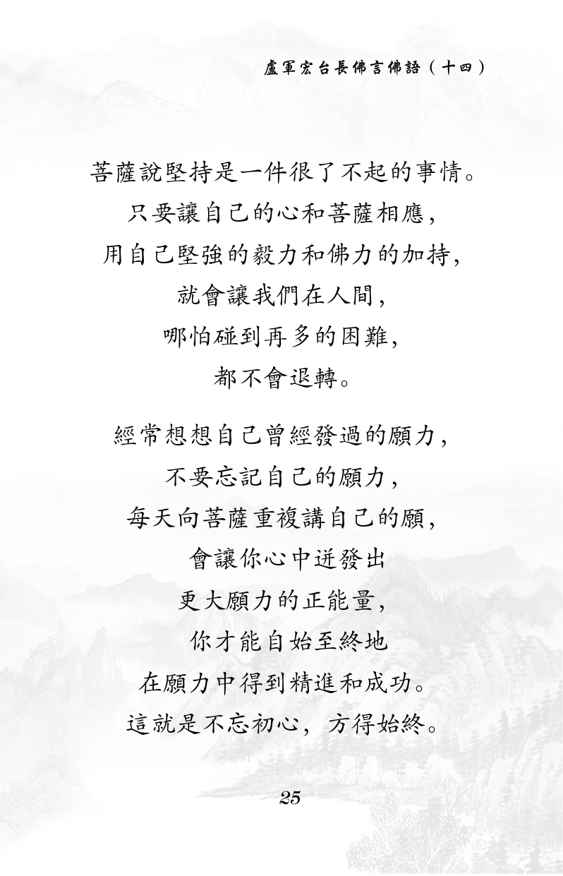 不限会员 菩薩說堅持是一件很了不起的事情。 只要讓自己的心和菩薩相應, 用自己堅強的毅力和佛力的加持, 就會讓我們在人間, 哪怕碰到再多的困難, 都不會退轉。 經常想想自己曾經發過的願力, 不要忘記自己的願力, 每天向菩薩重複講自己的願, 會讓你心中迸發出 更大願力的正能量, 你才能自始至終地 在願力中得到精進和成功。 這就是不忘初心,方得始終。 |佛言佛语(十四)