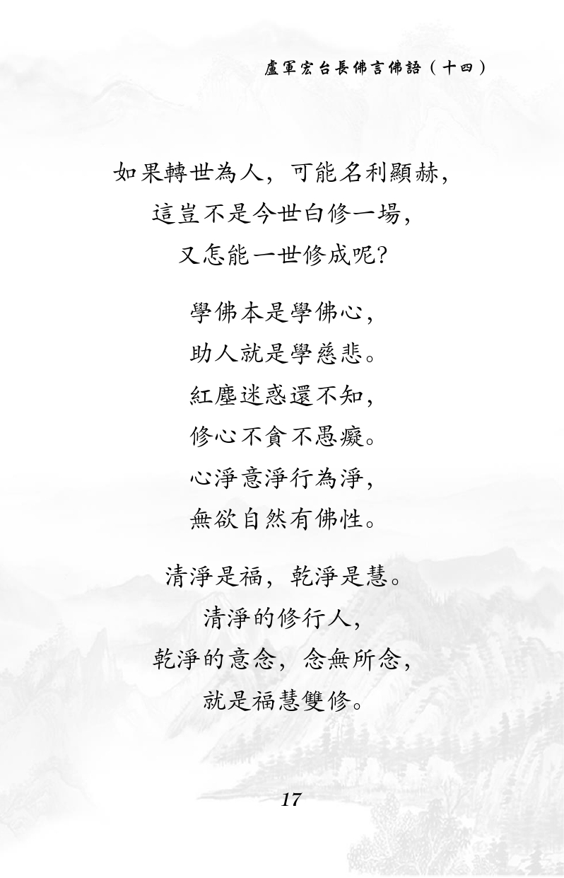 不限会员 如果轉世為人,可能名利顯赫, 這豈不是今世白修一場, 又怎能一世修成呢? 學佛本是學佛心, 助人就是學慈悲。 紅塵迷惑還不知, 修心不貪不愚癡。 心淨意淨行為淨, 無欲自然有佛性。 清淨是福,乾淨是慧。 清淨的修行人, 乾淨的意念,念無所念, 就是福慧雙修。 |佛言佛语(十四)
