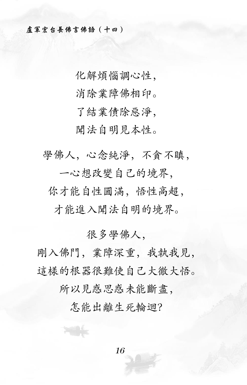 不限会员 化解煩惱調心性, 消除業障佛相印。 了結業債除惡淨, 聞法自明見本性。 學佛人,心念純淨,不貪不瞋, 一心想改變自己的境界, 你才能自性圓滿,悟性高超, 才能進入聞法自明的境界。 很多學佛人, 剛入佛門,業障深重,我執我見, 這樣的根器很難使自己大徹大悟。 所以見惑思惑未能斷盡, 怎能出離生死輪迴? |佛言佛语(十四)