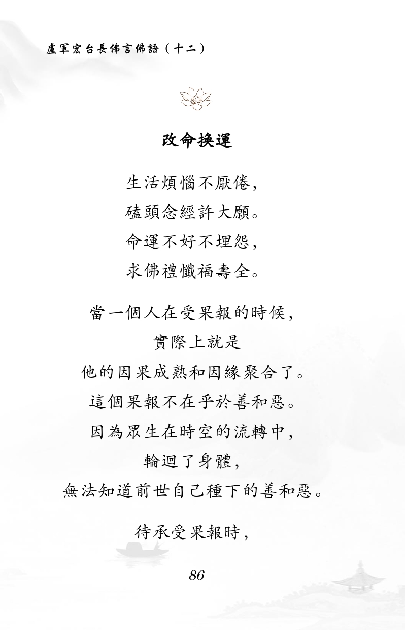 不限会员 改命换运 生活烦恼不厌倦, 磕头念经许大愿。 命运不好不埋怨, 求佛礼忏福寿全。 当一个人在受果报的时候, 实际上就是 他的因果成熟和因缘聚合了。 这个果报不在乎于善和恶。 因为众生在时空的流转中, 轮回了身体, 无法知道前世自己种下的善和恶。 待承受果报时, |佛言佛语(十二)