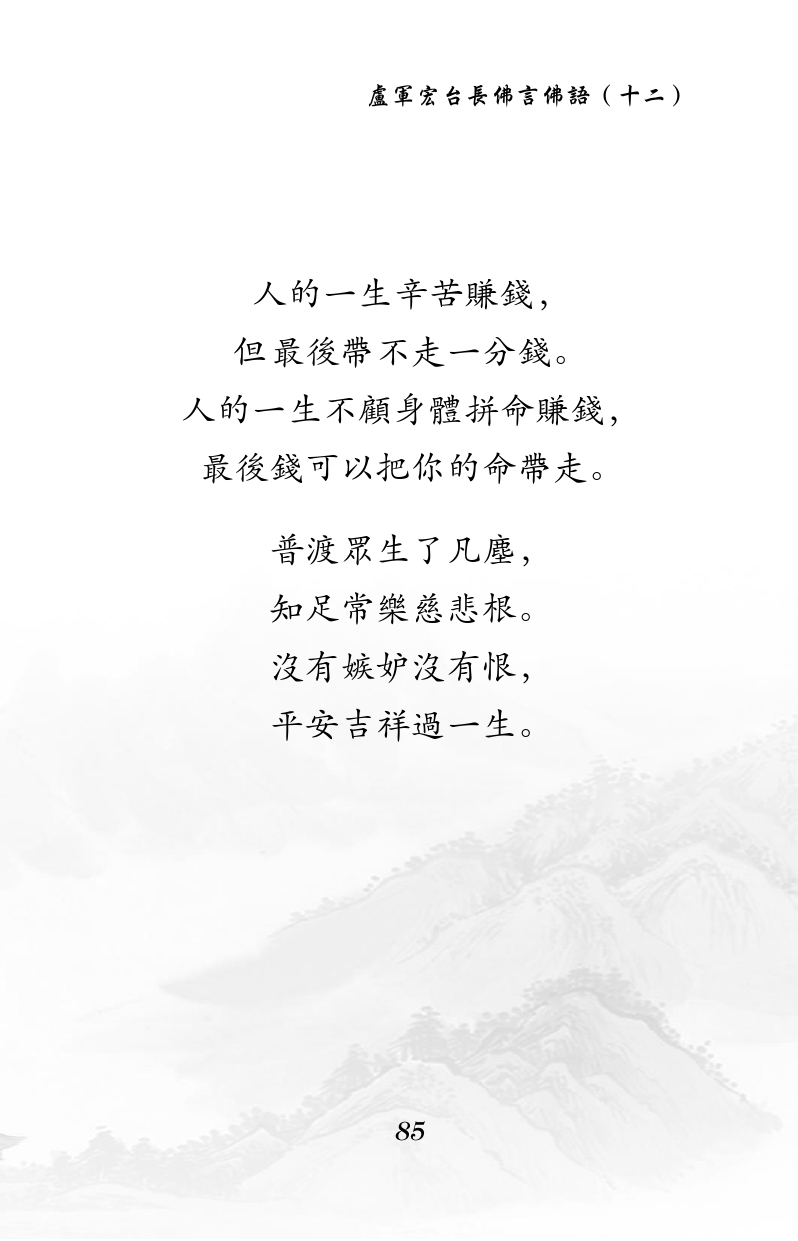 不限会员 人的一生辛苦赚钱, 但最后带不走一分钱。 人的一生不顾身体拼命赚钱, 最后钱可以把你的命带走。 普渡众生了凡尘, 知足常乐慈悲根。 没有嫉妒没有恨, 平安吉祥过一生。 |佛言佛语(十二)