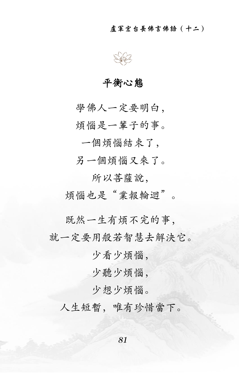 不限会员 平衡心态 学佛人一定要明白, 烦恼是一辈子的事。 一个烦恼结束了, 另一个烦恼又来了。 所以菩萨说, 烦恼也是“业报轮回”。 既然一生有烦不完的事, 就一定要用般若智慧去解决它。 少看少烦恼, 少听少烦恼, 少想少烦恼。 人生短暂,唯有珍惜当下。 |佛言佛语(十二)