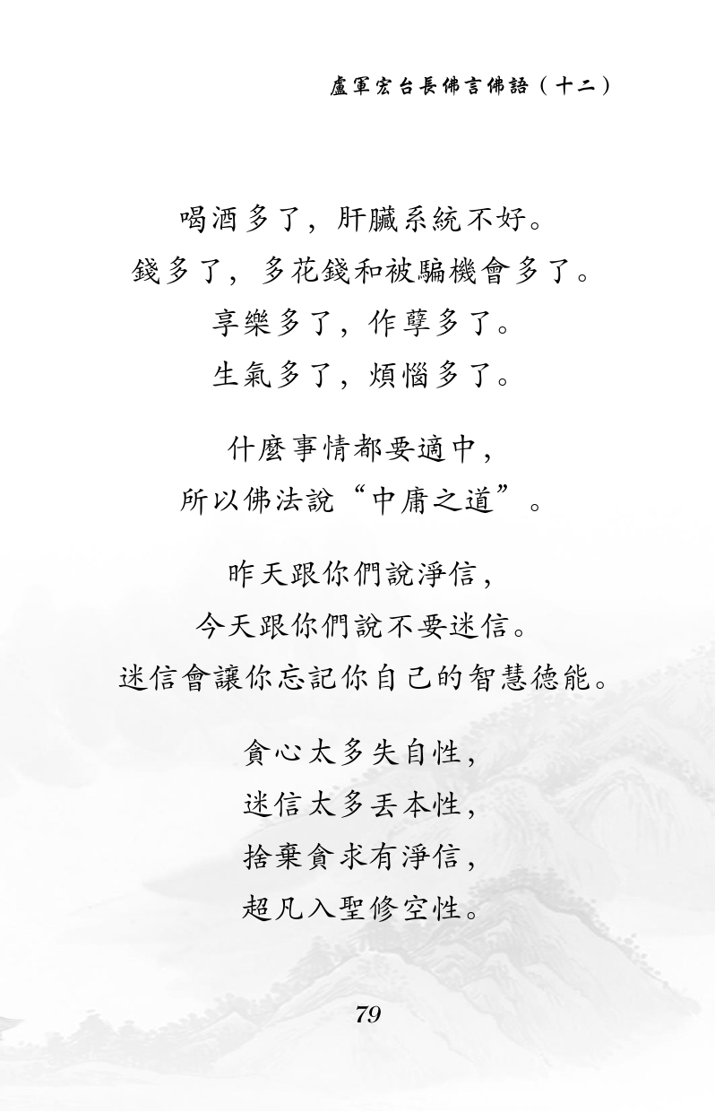 不限会员 喝酒多了,肝脏系统不好。 钱多了,多花钱和被骗机会多了。 享乐多了,作孽多了。 生气多了,烦恼多了。 什么事情都要适中, 所以佛法说“中庸之道”。 昨天跟你们说净信, 今天跟你们说不要迷信。 迷信会让你忘记你自己的智慧德能。 贪心太多失自性, 迷信太多丢本性, 舍弃贪求有净信, 超凡入圣修空性。 |佛言佛语(十二)