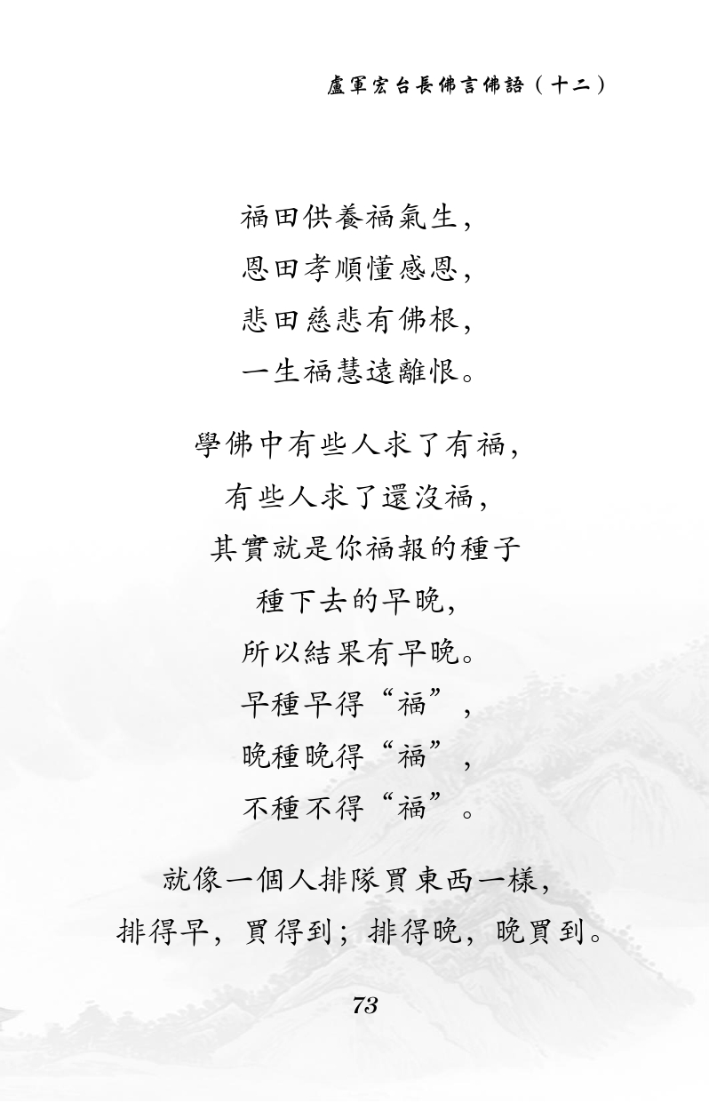 不限会员 福田供养福气生, 恩田孝顺懂感恩, 悲田慈悲有佛根, 一生福慧远离恨。 学佛中有些人求了有福, 有些人求了还没福, 其实就是你福报的种子 种下去的早晚, 所以结果有早晚。 早种早得“福”, 晚种晚得“福”, 不种不得“福”。 就像一个人排队买东西一样, 排得早,买得到;排得晚,晚买到。 |佛言佛语(十二)