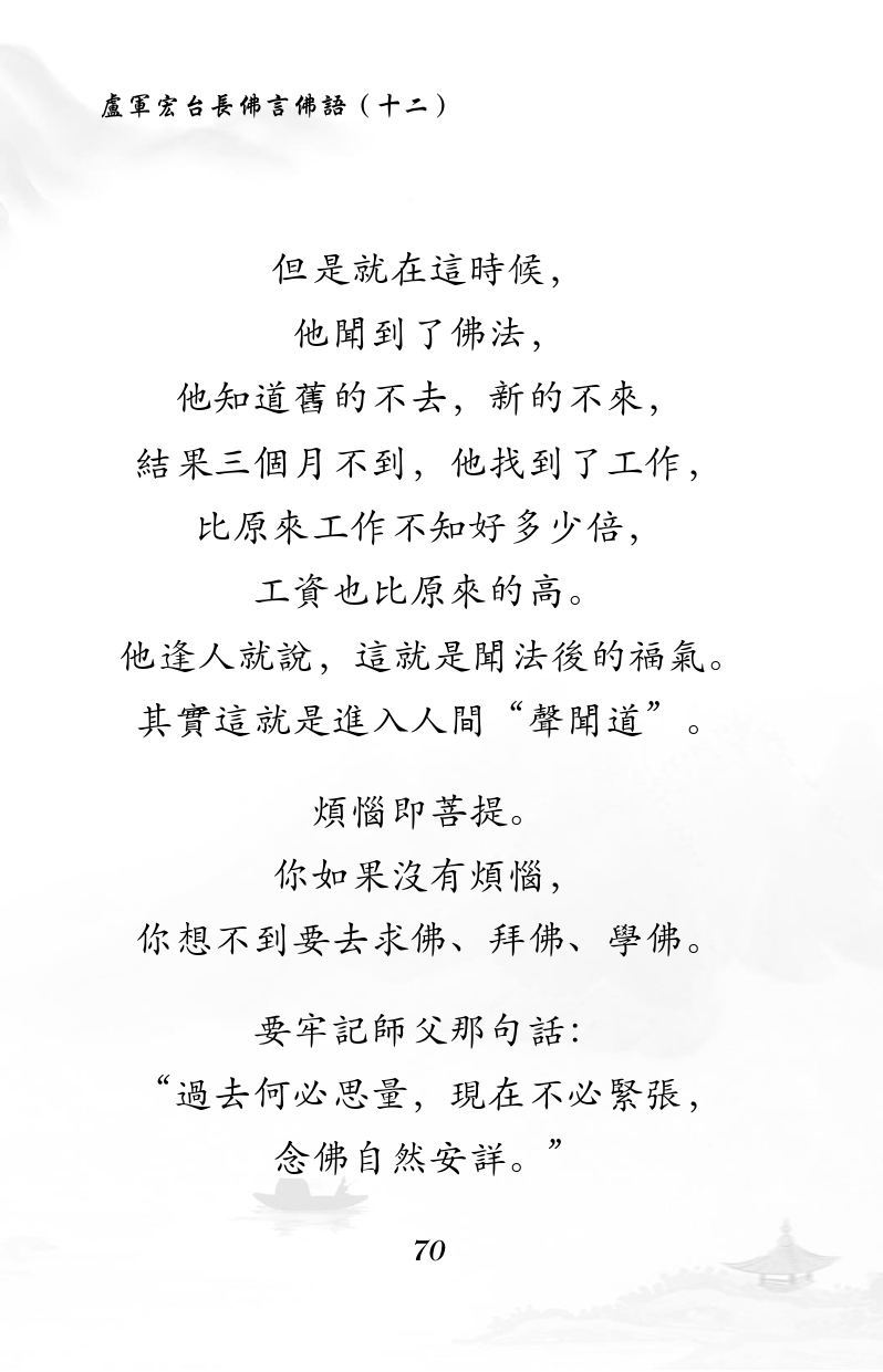不限会员 但是就在这时候, 他闻到了佛法, 他知道旧的不去,新的不来, 结果三个月不到,他找到了工作, 比原来工作不知好多少倍, 工资也比原来的高。 他逢人就说,这就是闻法后的福气。 其实这就是进入人间“声闻道”。 烦恼即菩提。 你如果没有烦恼, 你想不到要去求佛、拜佛、学佛。 要牢记师父那句话: “过去何必思量,现在不必紧张, 念佛自然安详。” |佛言佛语(十二)