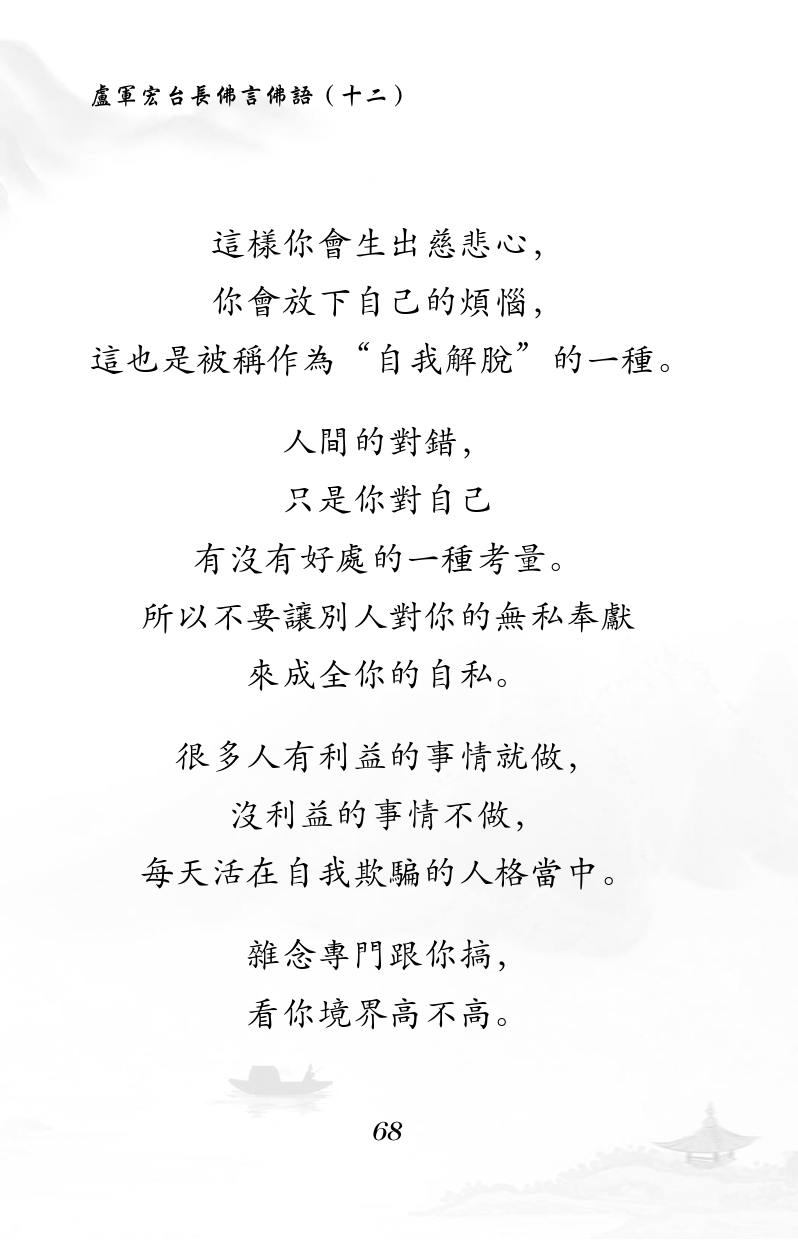 不限会员 这样你会生出慈悲心, 你会放下自己的烦恼, 这也是被称作为“自我解脱”的一种。 人间的对错, 只是你对自己 有没有好处的一种考量。 所以不要让别人对你的无私奉献 来成全你的自私。 很多人有利益的事情就做, 没利益的事情不做, 每天活在自我欺骗的人格当中。 杂念专门跟你搞, 看你境界高不高。 |佛言佛语(十二)