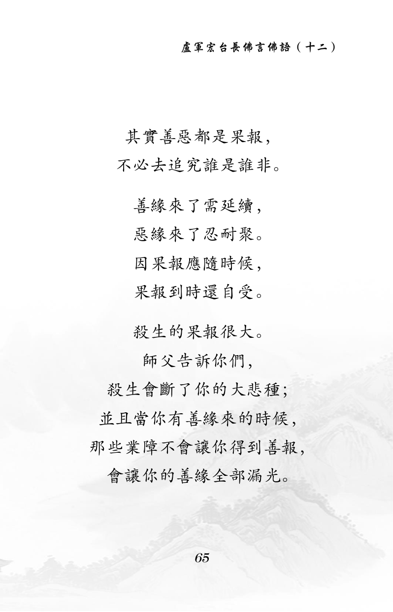 不限会员 其实善恶都是果报, 不必去追究谁是谁非。 善缘来了需延续, 恶缘来了忍耐聚。 因果报应随时候, 果报到时还自受。 杀生的果报很大。 师父告诉你们, 杀生会断了你的大悲种; 并且当你有善缘来的时候, 那些业障不会让你得到善报, 会让你的善缘全部漏光。 |佛言佛语(十二)