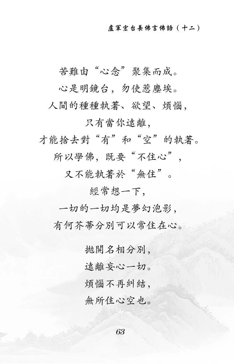 不限会员 苦难由“心念”聚集而成。 心是明镜台,勿使惹尘埃。 人间的种种执着、欲望、烦恼, 只有当你远离, 才能舍去对“有”和“空”的执着。 所以学佛,既要“不住心”, 又不能执着于“无住”。 经常想一下, 一切的一切均是梦幻泡影, 有何芥蒂分别可以常住在心。 抛开名相分别, 远离妄心一切。 烦恼不再纠结, 无所住心空也。 |佛言佛语(十二)