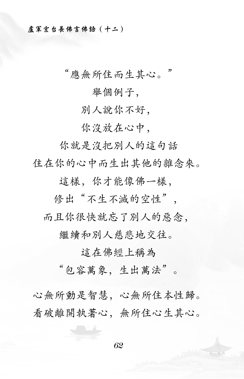 不限会员 “应无所住而生其心。” 举个例子, 别人说你不好, 你没放在心中, 你就是没把别人的这句话 住在你的心中而生出其他的杂念来。 这样,你才能像佛一样, 修出“不生不灭的空性”, 而且你很快就忘了别人的恶念, 继续和别人慈悲地交往。 这在佛经上称为 “包容万象,生出万法”。 心无所动是智慧,心无所住本性归。 看破离开执着心,无所住心生其心。 |佛言佛语(十二)