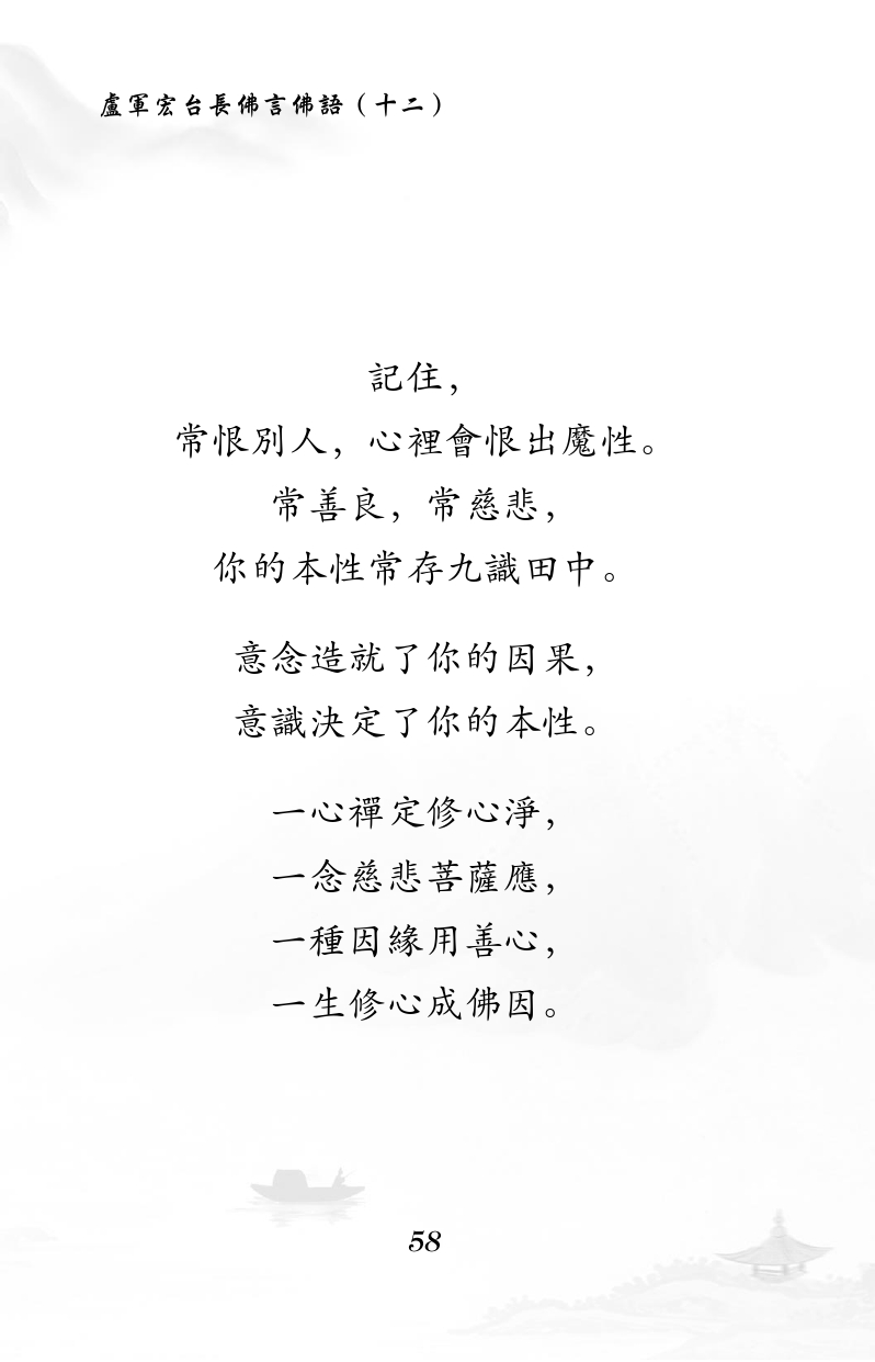 下一篇 : 宜将善良变慈悲, 不可贡高我慢归。 因缘果报人间累, 佛性佛