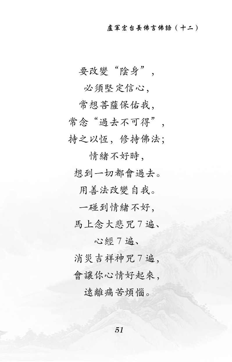 不限会员 要改变“阴身”, 必须坚定信心, 常想菩萨保佑我, 常念“过去不可得”, 持之以恒,修持佛法; 情绪不好时, 想到一切都会过去。 用善法改变自我。 一碰到情绪不好, 马上念大悲咒 7 遍、 心经 7 遍、 消灾吉祥神咒 7 遍, 会让你心情好起来, 远离痛苦烦恼。 |佛言佛语(十二)
