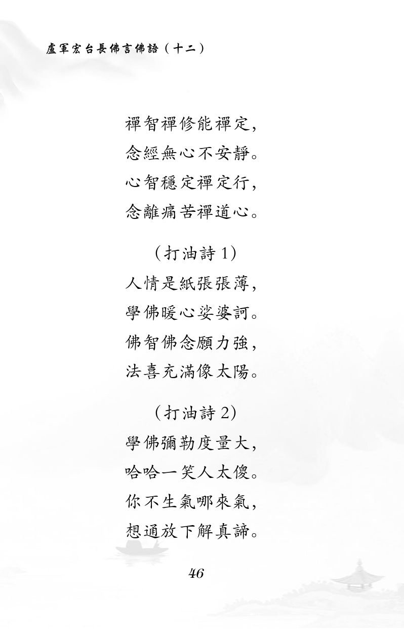 不限会员 禅智禅修能禅定, 念经无心不安静。 心智稳定禅定行, 念离痛苦禅道心。 (打油诗 1) 人情是纸张张薄, 学佛暖心娑婆诃。 佛智佛念愿力强, 法喜充满像太阳。 (打油诗 2) 学佛弥勒度量大, 哈哈一笑人太傻。 你不生气哪来气, 想通放下解真谛。 |佛言佛语(十二)
