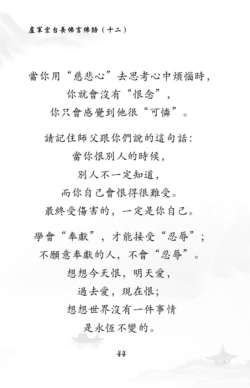 不限会员 当你用“慈悲心”去思考心中烦恼时, 你就会没有“恨念”, 你只会感觉到他很“可怜”。 请记住师父跟你们说的这句话: 当你恨别人的时候, 别人不一定知道, 而你自己会恨得很难受。 最终受伤害的,一定是你自己。 学会“奉献”,才能接受“忍辱”; 不愿意奉献的人,不会“忍辱”。 想想今天恨,明天爱, 过去爱,现在恨; 想想世界没有一件事情 是永恒不变的。 |佛言佛语(十二)