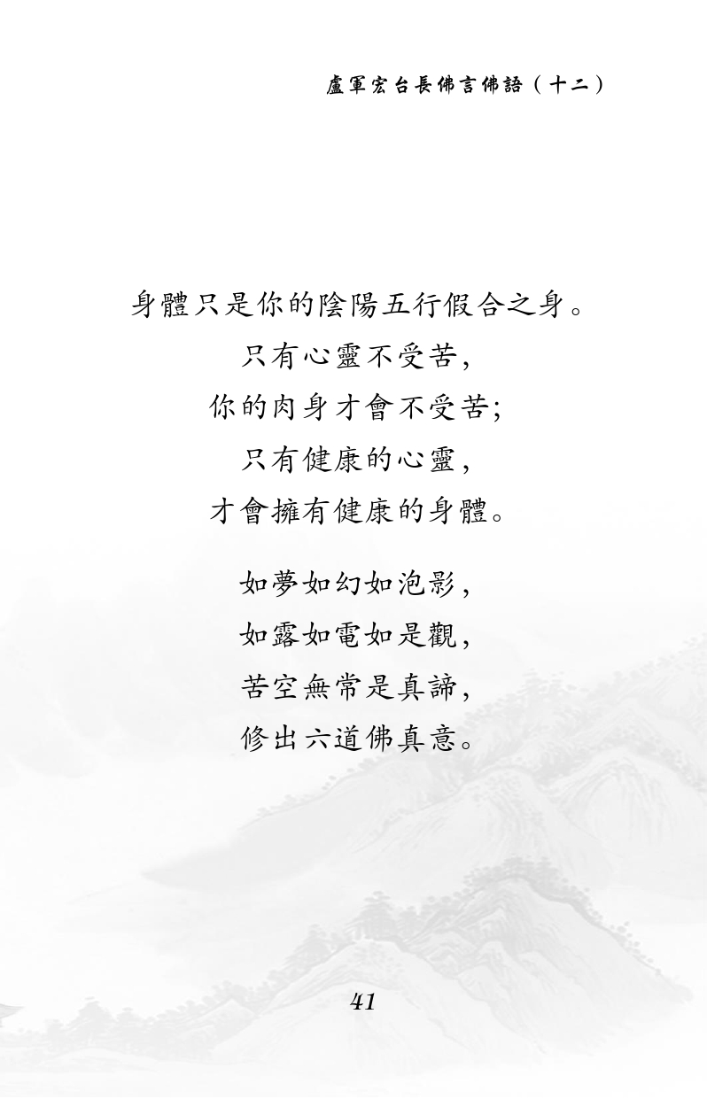 不限会员 身体只是你的阴阳五行假合之身。 只有心灵不受苦, 你的肉身才会不受苦; 只有健康的心灵, 才会拥有健康的身体。 如梦如幻如泡影, 如露如电如是观, 苦空无常是真谛, 修出六道佛真意。 |佛言佛语(十二)