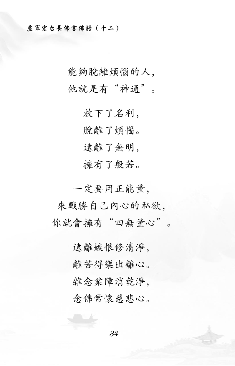 不限会员 能够脱离烦恼的人, 他就是有“神通”。 放下了名利, 脱离了烦恼。 远离了无明, 拥有了般若。 一定要用正能量, 来战胜自己内心的私欲, 你就会拥有“四无量心”。 远离嫉恨修清净, 离苦得乐出离心。 杂念业障消干净, 念佛常怀慈悲心。 |佛言佛语(十二)