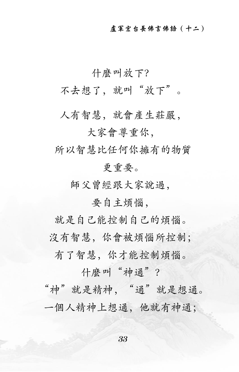 不限会员 什么叫放下? 不去想了,就叫“放下”。 人有智慧,就会产生庄严, 大家会尊重你, 所以智慧比任何你拥有的物质 更重要。 师父曾经跟大家说过, 要自主烦恼, 就是自己能控制自己的烦恼。 没有智慧,你会被烦恼所控制; 有了智慧,你才能控制烦恼。 什么叫“神通”? “神”就是精神,“通”就是想通。 一个人精神上想通,他就有神通; |佛言佛语(十二)