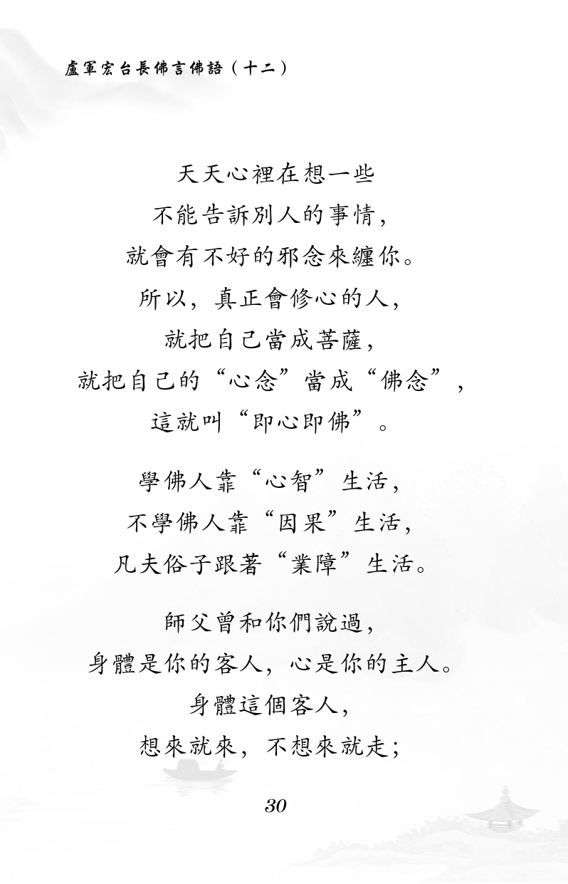 不限会员 天天心里在想一些 不能告诉别人的事情, 就会有不好的邪念来缠你。 所以,真正会修心的人, 就把自己当成菩萨, 就把自己的“心念”当成“佛念”, 这就叫“即心即佛”。 学佛人靠“心智”生活, 不学佛人靠“因果”生活, 凡夫俗子跟着“业障”生活。 师父曾和你们说过, 身体是你的客人,心是你的主人。 身体这个客人, 想来就来,不想来就走; |佛言佛语(十二)
