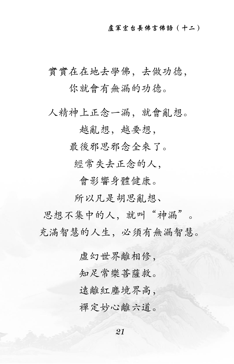 不限会员 实实在在地去学佛,去做功德, 你就会有无漏的功德。 人精神上正念一漏,就会乱想。 越乱想,越要想, 最后邪思邪念全来了。 经常失去正念的人, 会影响身体健康。 所以凡是胡思乱想、 思想不集中的人,就叫“神漏”。 充满智慧的人生,必须有无漏智慧。 虚幻世界离相修, 知足常乐菩萨救。 远离红尘境界高, 禅定妙心离六道。 |佛言佛语(十二)