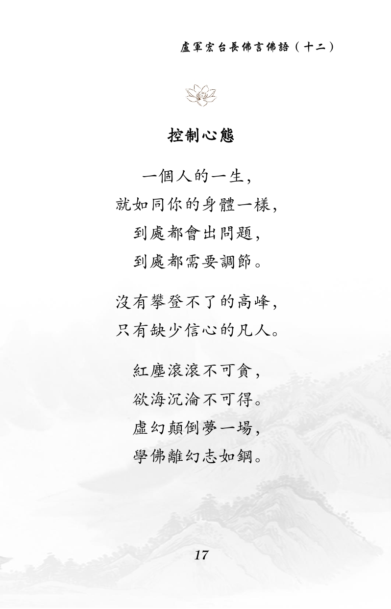 不限会员 控制心态 一个人的一生, 就如同你的身体一样, 到处都会出问题, 到处都需要调节。 没有攀登不了的高峰, 只有缺少信心的凡人。 红尘滚滚不可贪, 欲海沉沦不可得。 虚幻颠倒梦一场, 学佛离幻志如钢。 |佛言佛语(十二)