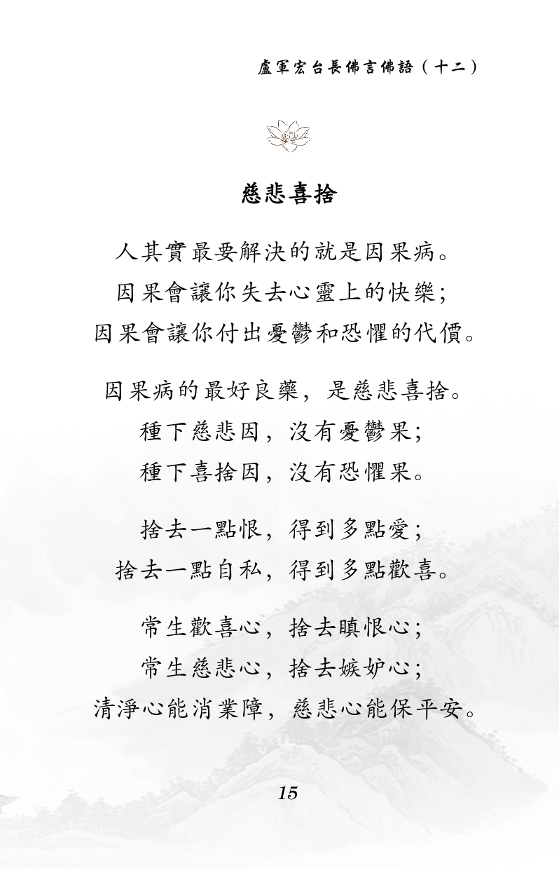 不限会员 慈悲喜舍 人其实最要解决的就是因果病。 因果会让你失去心灵上的快乐; 因果会让你付出忧郁和恐惧的代价。 因果病的最好良药,是慈悲喜舍。 种下慈悲因,没有忧郁果; 种下喜舍因,没有恐惧果。 舍去一点恨,得到多点爱; 舍去一点自私,得到多点欢喜。 常生欢喜心,舍去瞋恨心; 常生慈悲心,舍去嫉妒心; 清净心能消业障,慈悲心能保平安。 |佛言佛语(十二)