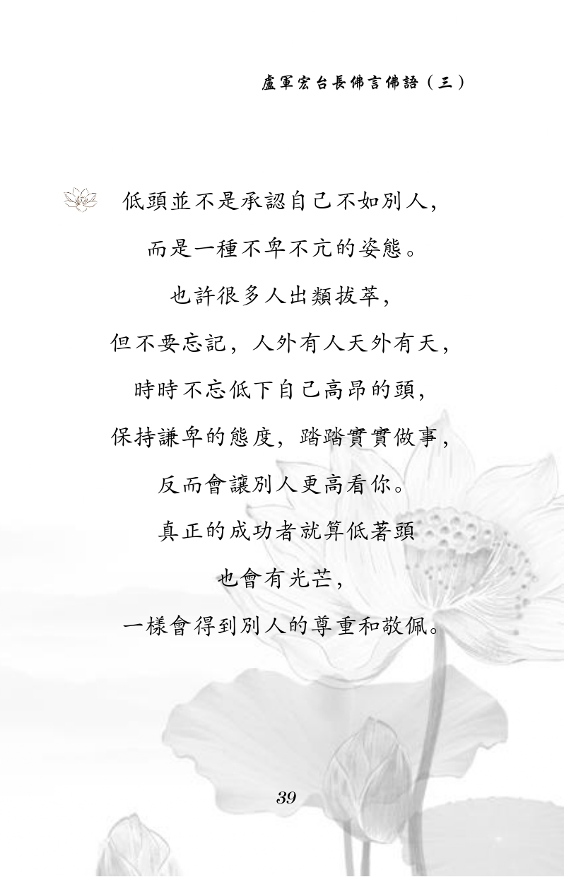 不限会员 低头并不是承认自己不如别人, 而是一种不卑不亢的姿态。 也许很多人出类拔萃, 但不要忘记,人外有人天外有天, 时时不忘低下自己高昂的头, 保持谦卑的态度,踏踏实实做事, 反而会让别人更高看你。 真正的成功者就算低着头也会有光芒, 一样会得到别人的尊重和敬佩。|佛言佛语 第三册