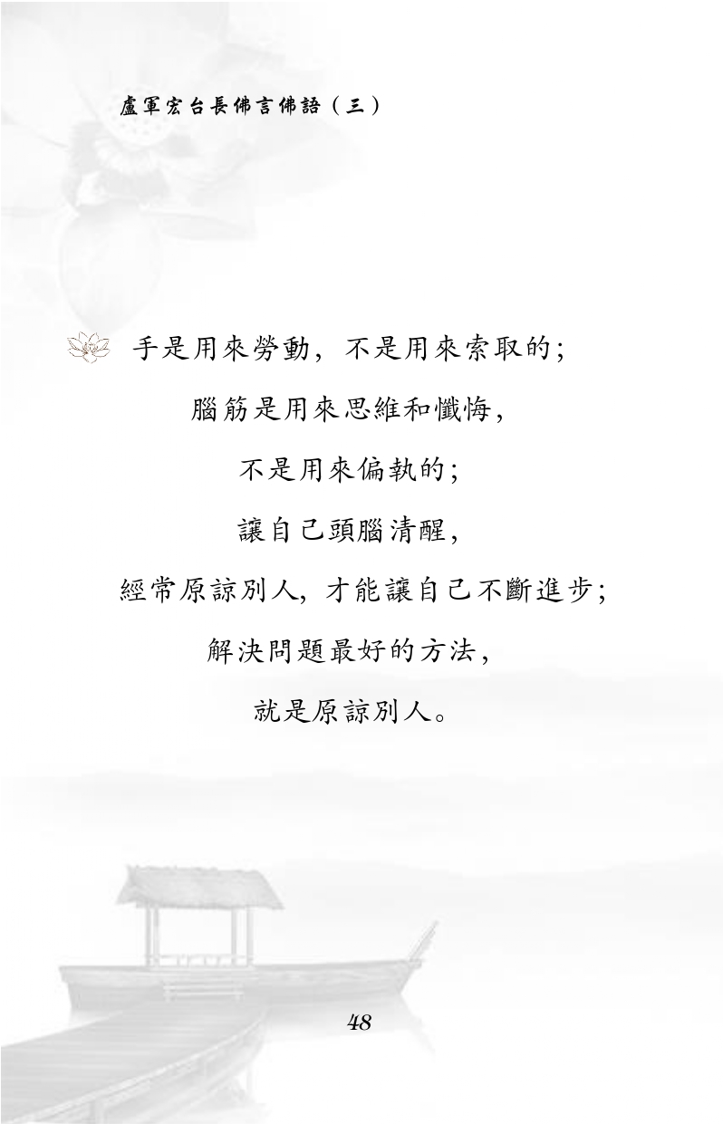 不限会员 手是用来劳动,不是用来索取的; 脑筋是用来思维和忏悔,不是用来偏执的; 让自己头脑清醒,经常原谅别人,才能让自己不断进步; 解决问题最好的方法,就是原谅别人。|佛言佛语 第三册