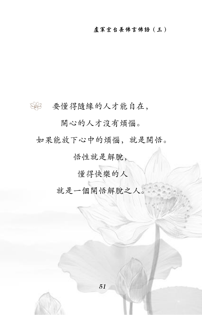 不限会员 要懂得随缘的人才能自在, 开心的人才没有烦恼。 如果能放下心中的烦恼,就是开悟。 悟性就是解脱,懂得快乐的人 就是一个开悟解脱之人。|佛言佛语 第三册