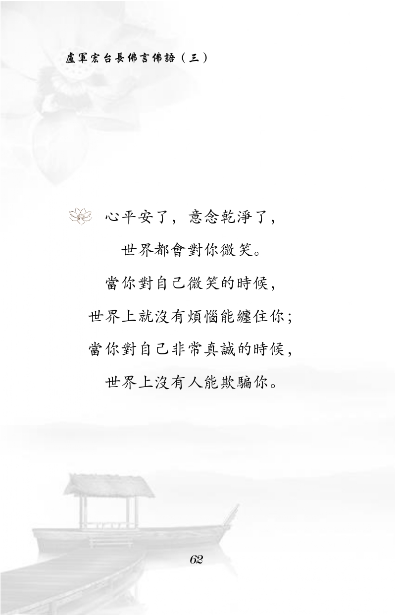 不限会员 心平安了,意念干净了, 世界都会对你微笑。 当你对自己微笑的时候, 世界上就没有烦恼能缠住你; 当你对自己非常真诚的时候,世界上没有人能欺骗你。|佛言佛语 第三册