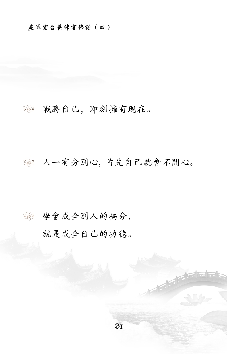 不限会员 战胜自己,即刻拥有现在。 人一有分别心,首先自己就会不开心。 学会成全别人的福分, 就是成全自己的功德。 |佛言佛语 第四册