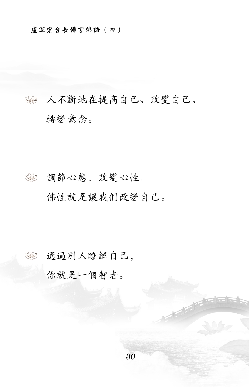 不限会员 人不断地在提高自己、改变自己、 转变意念。 调节心态,改变心性。 佛性就是让我们改变自己。 通过别人了解自己, 你就是一个智者。 |佛言佛语 第四册