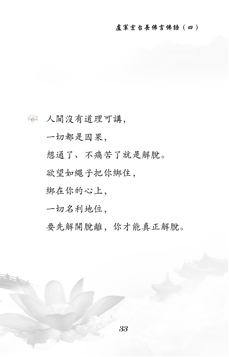 不限会员 人间没有道理可讲, 一切都是因果, 想通了、不痛苦了就是解脱。 欲望如绳子把你绑住, 绑在你的心上, 一切名利地位, 要先解开脱离,你才能真正解脱。|佛言佛语 第四册