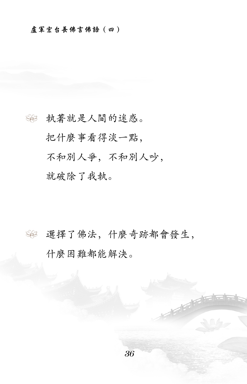不限会员 执着就是人间的迷惑。 把什么事看得淡一点, 不和别人争,不和别人吵, 就破除了我执。 选择了佛法,什么奇迹都会发生, 什么困难都能解决。 |佛言佛语 第四册