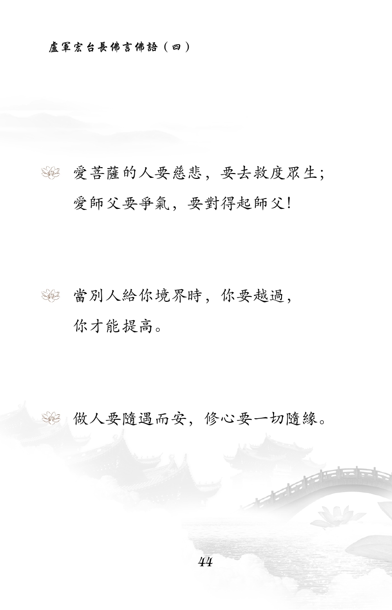 不限会员 爱菩萨的人要慈悲,要去救度众生; 爱师父要争气,要对得起师父! 当别人给你境界时,你要越过, 你才能提高。 做人要随遇而安,修心要一切随缘。 |佛言佛语 第四册