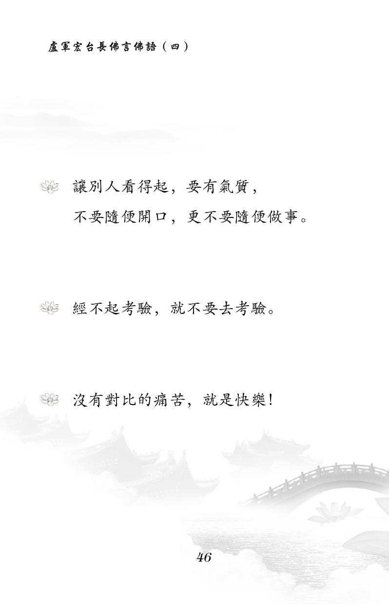 不限会员 让别人看得起,要有气质, 不要随便开口,更不要随便做事。 经不起考验,就不要去考验。 没有对比的痛苦,就是快乐! |佛言佛语 第四册
