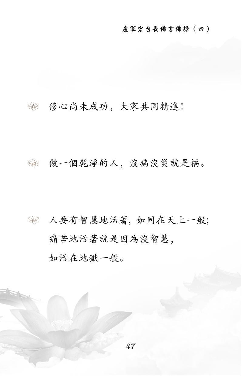 不限会员 修心尚未成功,大家共同精进! 做一个干净的人,没病没灾就是福。 人要有智慧地活着,如同在天上一般; 痛苦地活着就是因为没智慧, 如活在地狱一般。 |佛言佛语 第四册