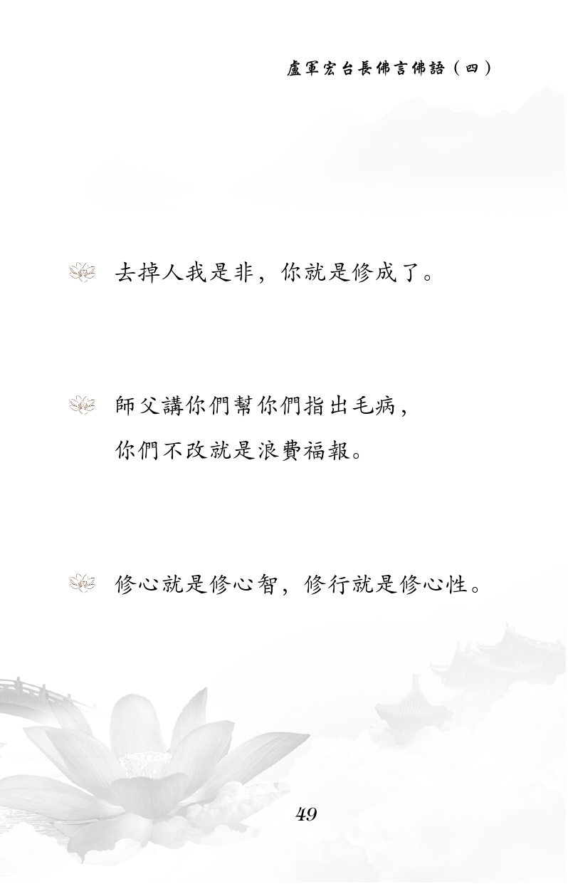 不限会员 去掉人我是非,你就是修成了。 师父讲你们帮你们指出毛病, 你们不改就是浪费福报。 修心就是修心智,修行就是修心性。 |佛言佛语 第四册
