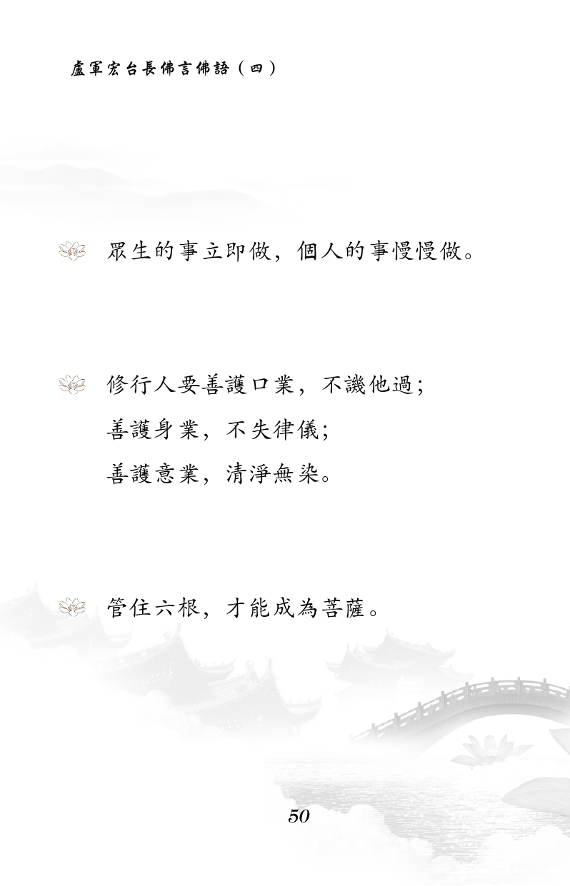 不限会员 众生的事立即做,个人的事慢慢做。 修行人要善护口业,不讥他过; 善护身业,不失律仪; 善护意业,清净无染。 管住六根,才能成为菩萨。 |佛言佛语 第四册