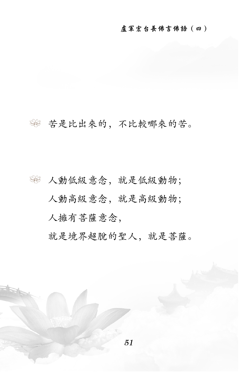 不限会员 苦是比出来的,不比较哪来的苦。 人动低级意念,就是低级动物; 人动高级意念,就是高级动物; 人拥有菩萨意念, 就是境界超脱的圣人,就是菩萨。 |佛言佛语 第四册