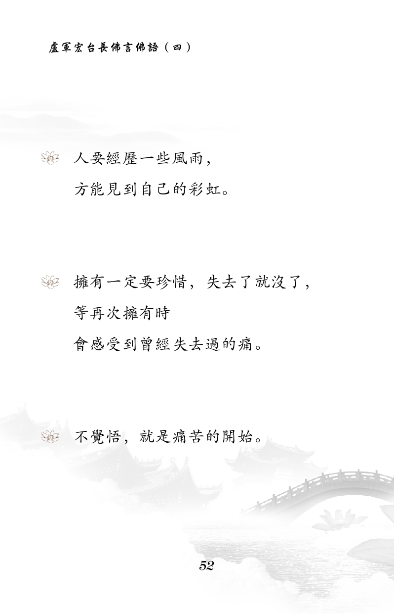 不限会员 人要经历一些风雨, 方能见到自己的彩虹。 拥有一定要珍惜,失去了就没了, 等再次拥有时会感受到曾经失去过的痛。 不觉悟,就是痛苦的开始。 |佛言佛语 第四册
