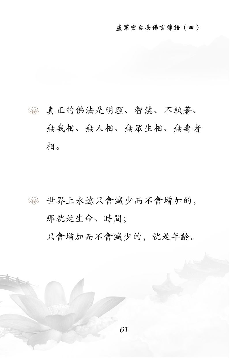 不限会员 真正的佛法是明理、智慧、不执着、 无我相、无人相、无众生相、无寿者相。 世界上永远只会减少而不会增加的, 那就是生命、时间; 只会增加而不会减少的,就是年龄。 |佛言佛语 第四册
