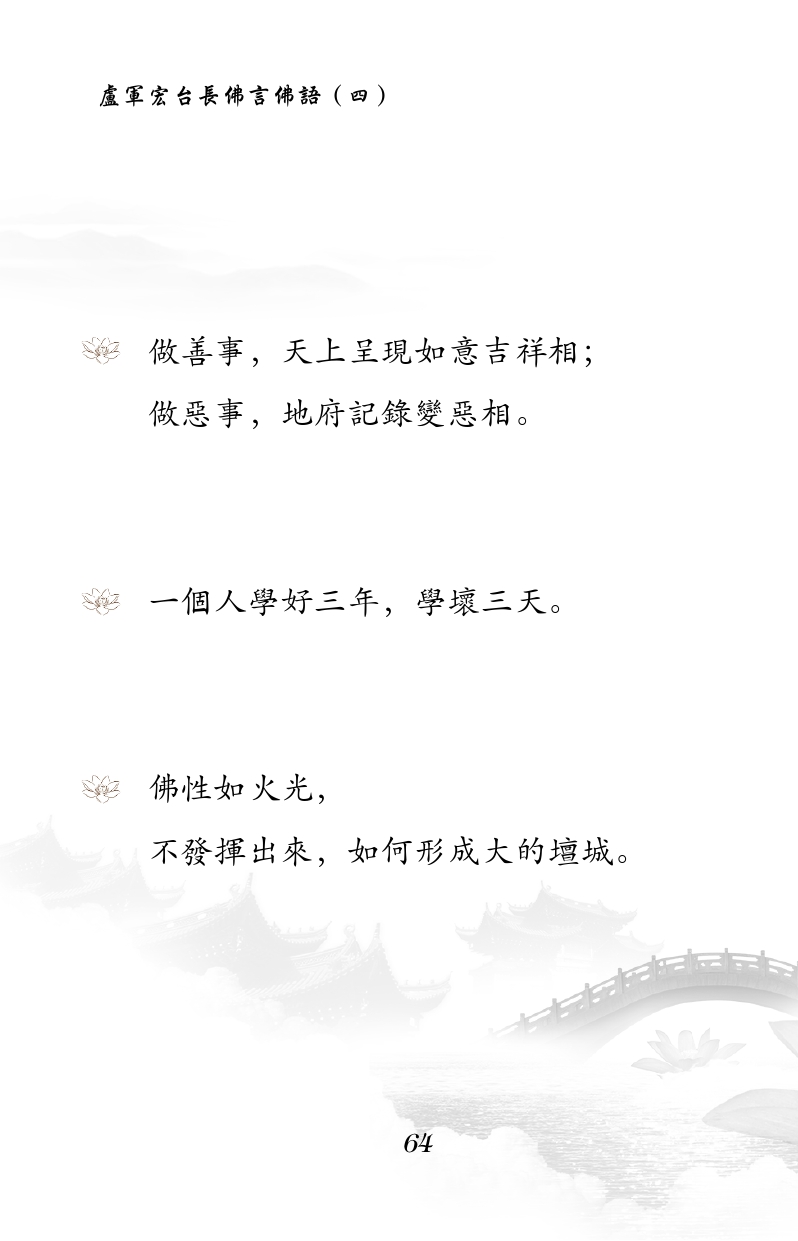 不限会员 做善事,天上呈现如意吉祥相; 做恶事,地府记录变恶相。 一个人学好三年,学坏三天。 佛性如火光,不发挥出来, 如何形成大的坛城。|佛言佛语 第四册