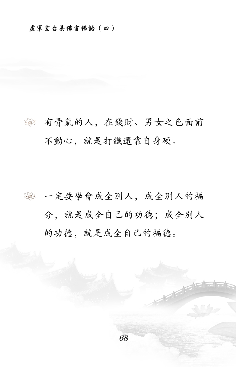 不限会员 有骨气的人,在钱财、男女之色面前 不动心,就是打铁还靠自身硬。 一定要学会成全别人,成全别人的福分, 就是成全自己的功德; 成全别人的功德,就是成全自己的福德。 |佛言佛语 第四册