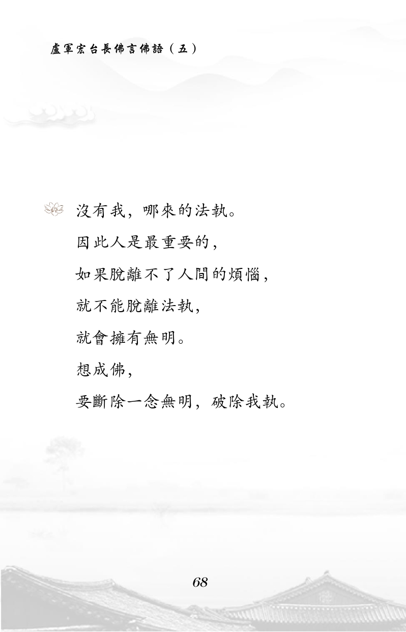 不限会员 没有我,哪来的法执。 因此人是最重要的, 如果脱离不了人间的烦恼, 就不能脱离法执, 就会拥有无明。 想成佛, 要断除一念无明,破除我执。 |佛言佛语 第五册