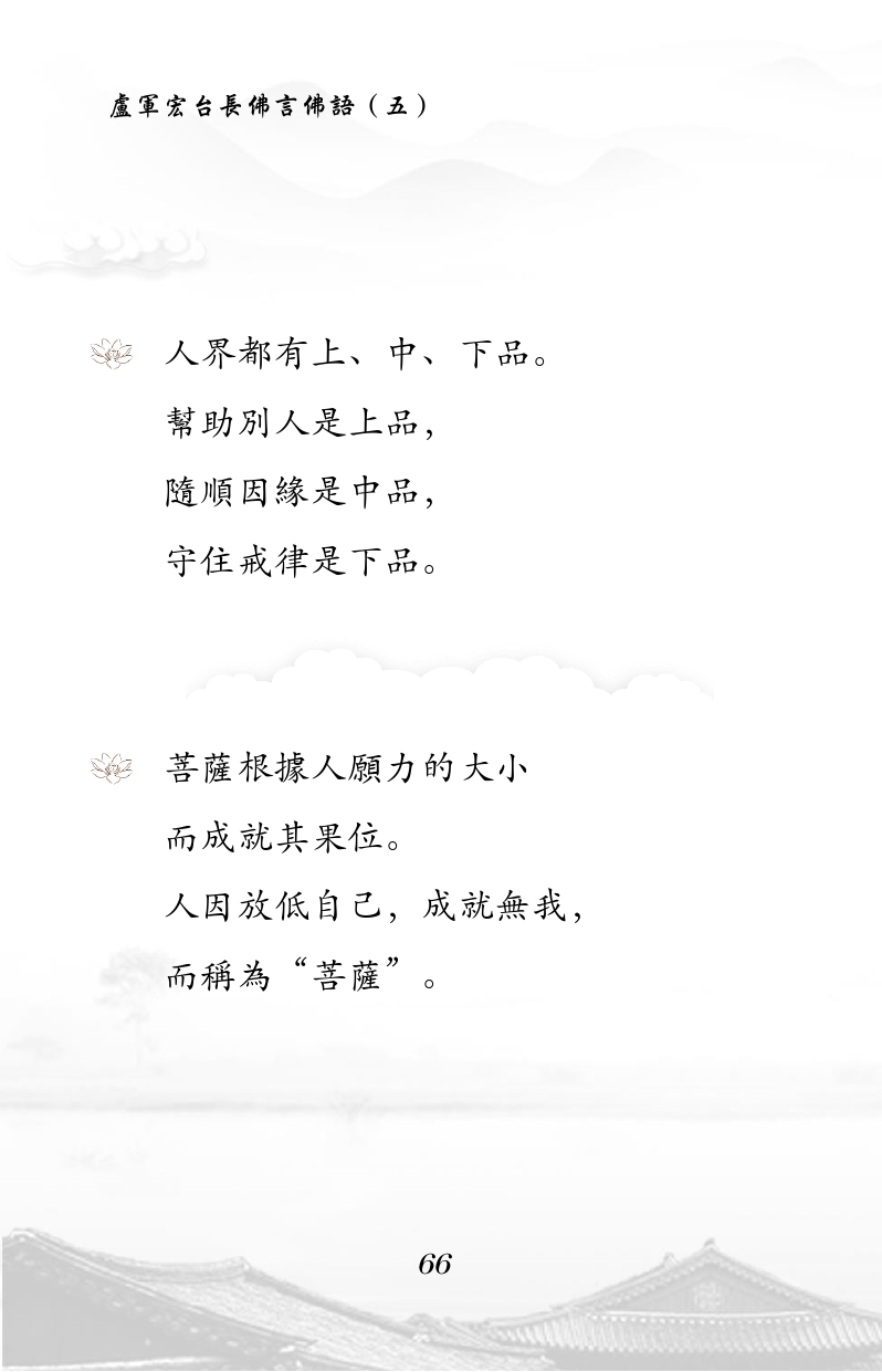 不限会员 人界都有上、中、下品。 帮助别人是上品, 随顺因缘是中品, 守住戒律是下品。 菩萨根据人愿力的大小 而成就其果位。 人因放低自己,成就无我, 而称为“菩萨”。 |佛言佛语 第五册