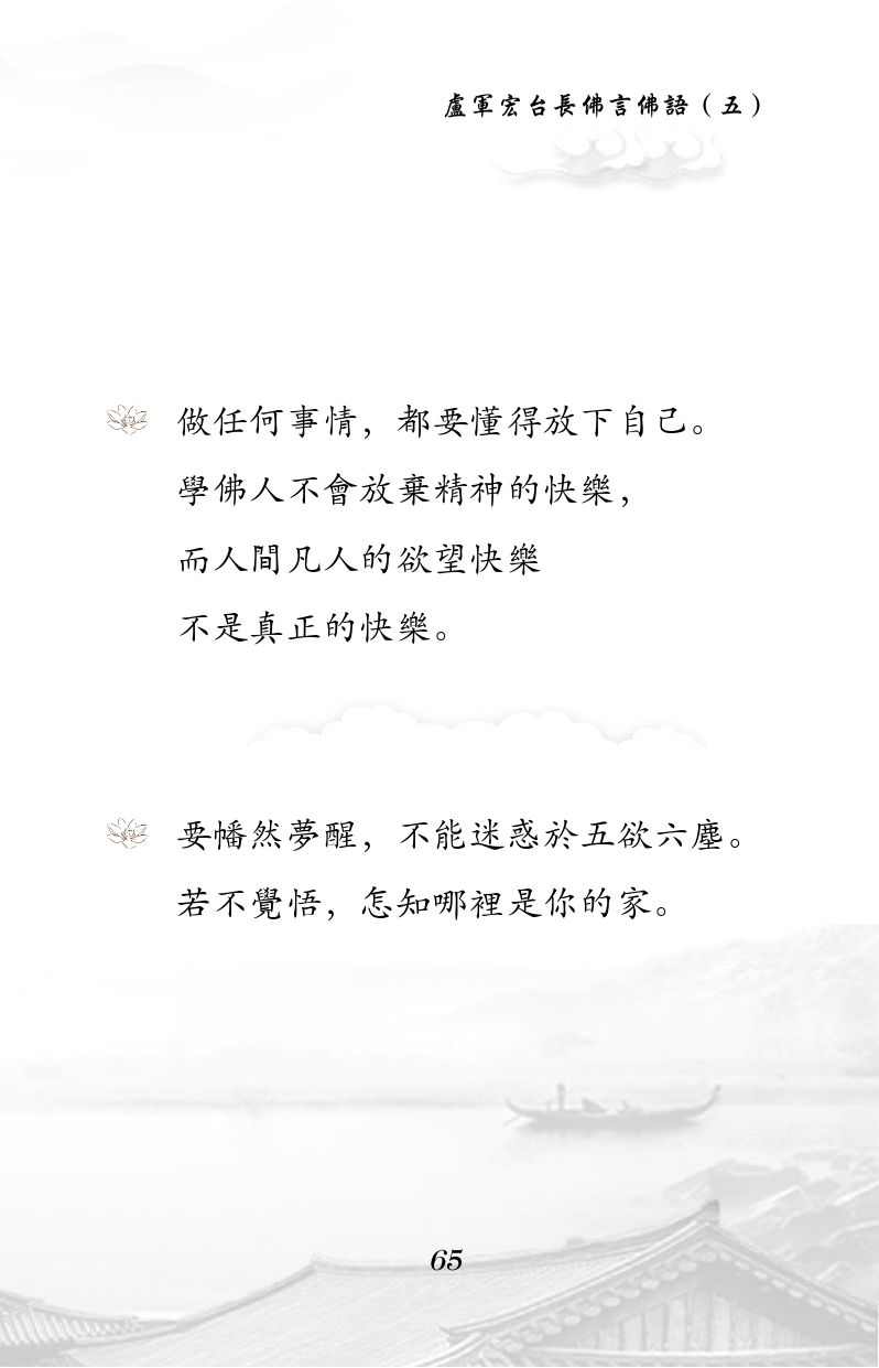 不限会员 做任何事情,都要懂得放下自己。 学佛人不会放弃精神的快乐, 而人间凡人的欲望快乐 不是真正的快乐。 要幡然梦醒,不能迷惑于五欲六尘。 若不觉悟,怎知哪里是你的家。 |佛言佛语 第五册