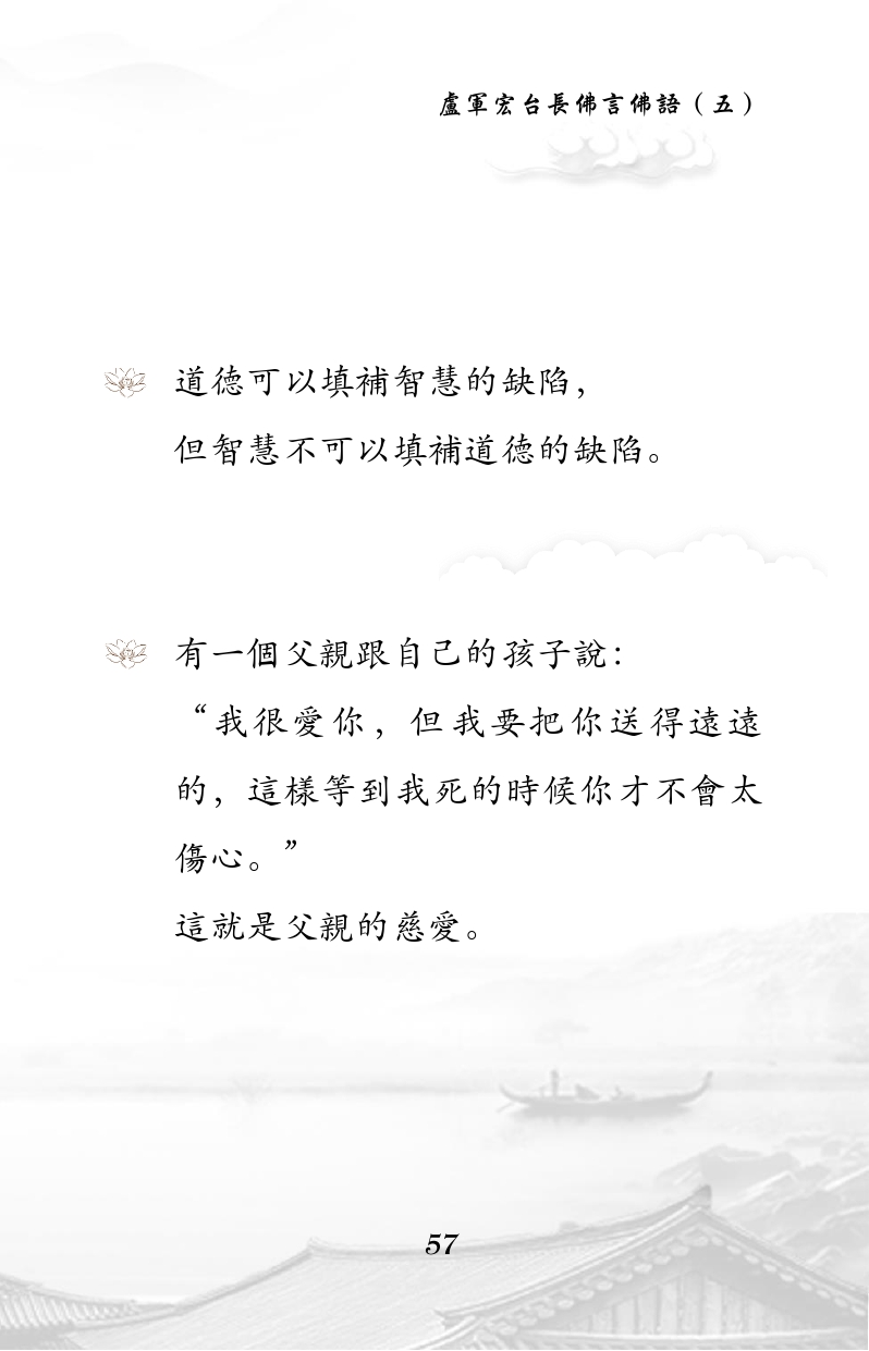 不限会员 道德可以填补智慧的缺陷, 但智慧不可以填补道德的缺陷。 有一个父亲跟自己的孩子说: “我很爱你,但我要把你送得远远 的,这样等到我死的时候你才不会太 伤心。” 这就是父亲的慈爱。 |佛言佛语 第五册