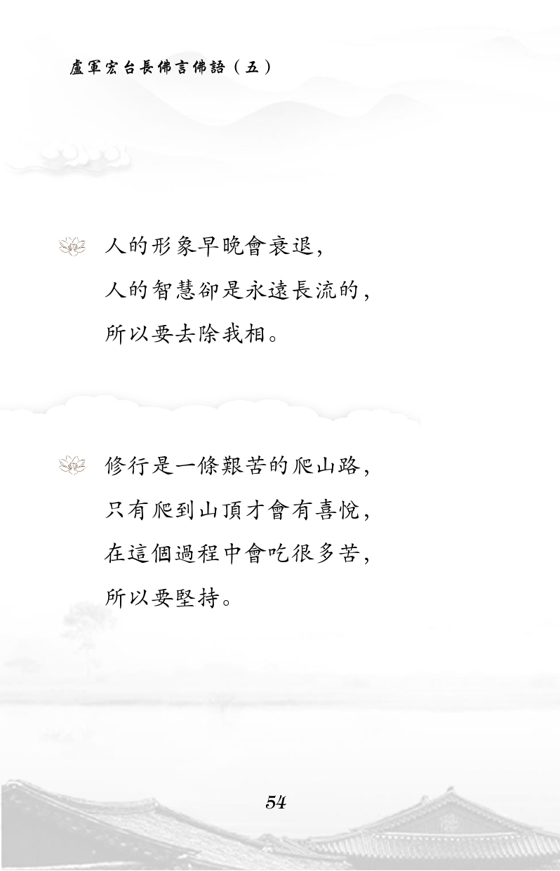 不限会员 人的形象早晚会衰退, 人的智慧却是永远长流的, 所以要去除我相。 修行是一条艰苦的爬山路, 只有爬到山顶才会有喜悦, 在这个过程中会吃很多苦, 所以要坚持。 |佛言佛语 第五册