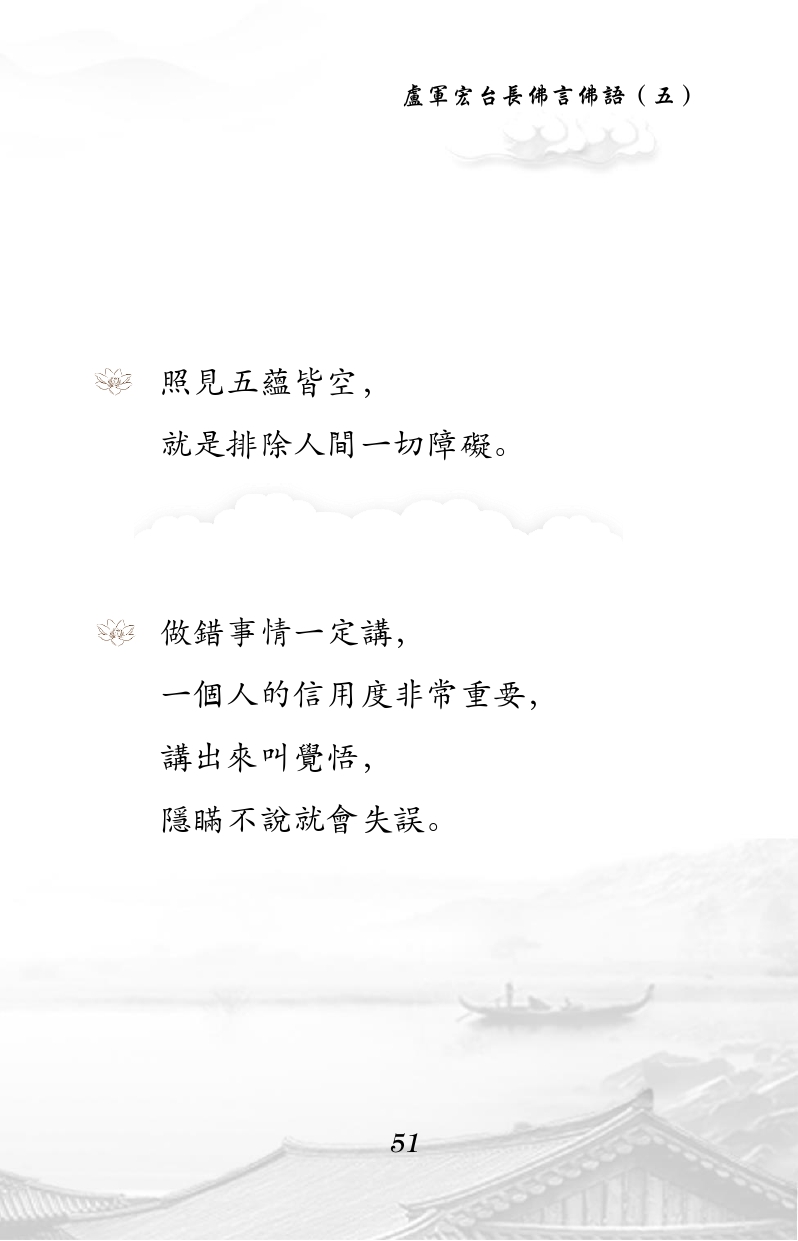 不限会员 照见五蕴皆空, 就是排除人间一切障碍。 做错事情一定讲, 一个人的信用度非常重要, 讲出来叫觉悟, 隐瞒不说就会失误。 |佛言佛语 第五册