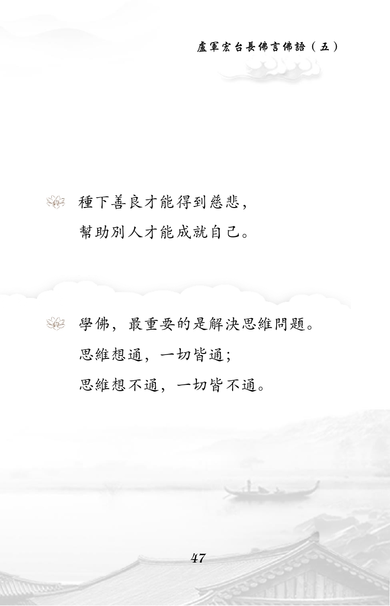 不限会员 种下善良才能得到慈悲, 帮助别人才能成就自己。 学佛,最重要的是解决思维问题。 思维想通,一切皆通; 思维想不通,一切皆不通。 |佛言佛语 第五册