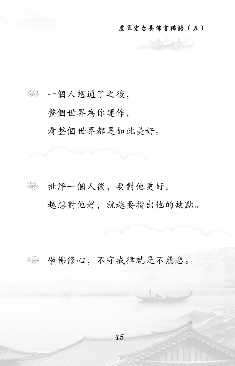 不限会员 一个人想通了之后, 整个世界为你运作, 看整个世界都是如此美好。 批评一个人后,要对他更好。 越想对他好,就越要指出他的缺点。 学佛修心,不守戒律就是不慈悲。 |佛言佛语 第五册